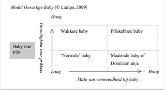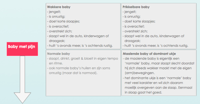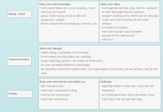 Het schema gaat ervan uit dat de grootste groep baby’s onrustig is vanwege (over)vermoeidheid of overprikkeling. Je komt dan uit op vier typen onrustige baby’s (de normale baby is niet onrustig, maar de maatstaf).