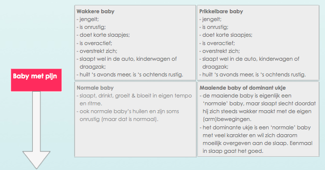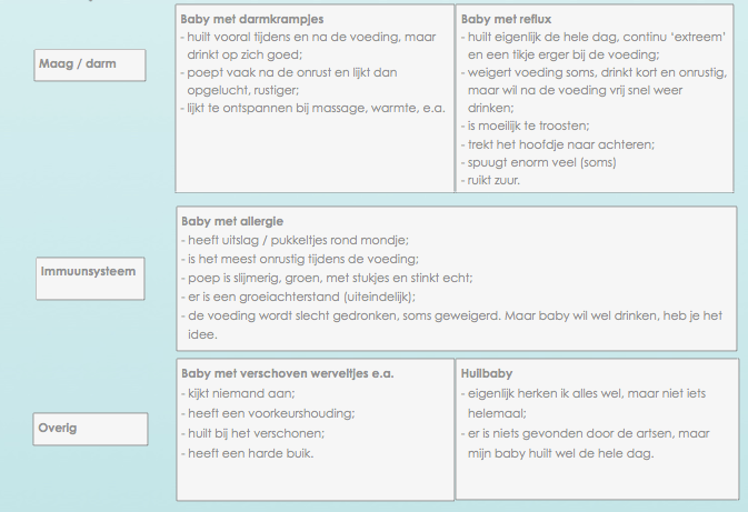 Buiten de tabel valt de baby met pijn. Deze baby moet eerst behandeld worden alvorens reguliere adviezen als rust & regelmaat zin hebben. Hoe weet je nu in welk vakje jouw baby hoort? Heel simpel: bekijk hieronder de symptomen die bij ieder type horen en je hebt een aardig vermoeden welk vakje op jouw baby van toepassing is. De symptomen die bij de prikkelbare baby horen zijn op nagenoeg alle onrustige baby’s van toepassing. Bij elke oorzaak van de pijn komen daar specifieke symptomen bij, zodat je precies kunt zien wat er eventueel aan de hand is. Herken je meer uit verschillende blokjes? Het kan natuurlijk best zijn dat je baby bijvoorbeeld en reflux heeft en een allergie!