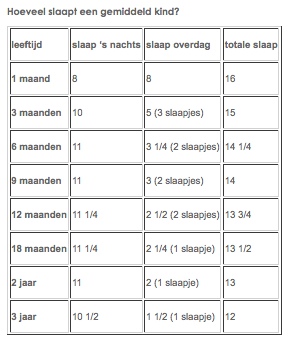 Wat de tabel je zegt is hoeveel slaap een gemiddeld kind op een bepaalde leeftijd nodig heeft. Als je de slaap ’s nachts en overdag bij elkaar optelt, kom je op de totale uren slaap uit. Heb je nu een eigenwijze peuter van 2 jaar die vroegtijdig de middagdut gedag heeft gezegd? Dan is dat prima als hij het gedurende dag daarmee redt. Uiteraard is het dan wel de bedoeling dat je peutertje dan ’s nachts wat meer slaapt, om wel de totale uren slaap gewoon te halen. Het is dus wel de bedoeling dat hij van de 24 uur die een dag telt gemiddeld 13 uur slaapt. Dat kan in een ruk ’s nachts of verdeeld over een middagdut en een nachtrust. Skipt je peuter de middagdut en staat de tijd van opstaan ’s ochtends vast in je gezin? Dan breng je je peutertje dus eerder naar bed voor de nacht, zodat je wel aan de totale slaapduur komt. Een peuter die wel een middagdut doet, kan later naar bed, omdat zijn nacht minder lang hoeft te duren. Nogmaals, het is een richtlijn: als je kleintje moe is om 1900 uur en duidelijk slaapsignalen afgeeft, terwijl de bedtijd 1930 uur is, dan breng je hem natuurlijk gewoon om 1900 naar bed.